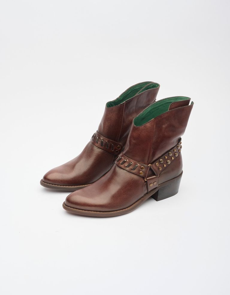 מגפונים שטוחים עשויים עור בעבודת יד במראה עתידני וחד פעמי ומעוטרים ברצועות עור קצרות בחלקם החיצוני. נעליים לנשים שלא מפחדות לראות ולהיראות.