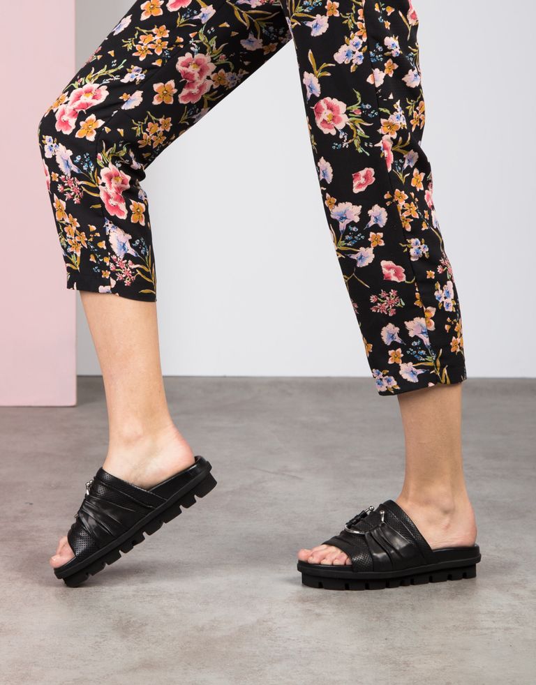 אזל המלאי ):כפכפי עור בשילוב חוטי כסף, מאובזרים בחישוק מתכת גדול וסוליית חריצים מוגבהת.