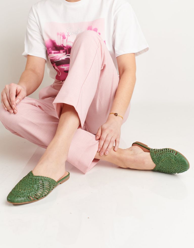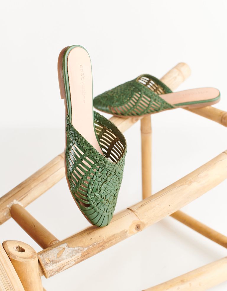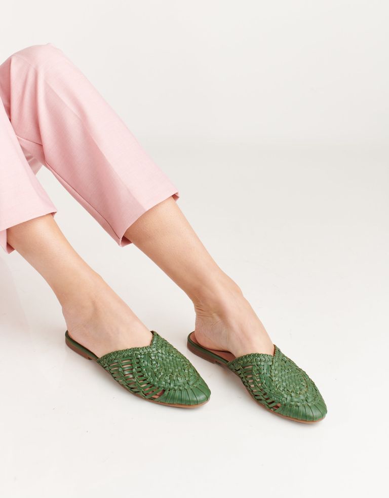 כפכפים שטוחים בסגנון מיולס, עשויים עור בעבודת יד ובמראה קלוע ואוריינטלי במידה.