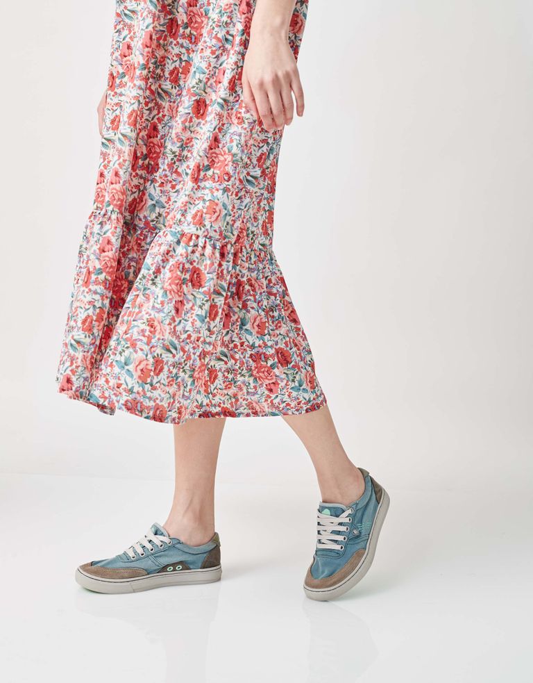 סניקרס בד REIWA של סאטוריסן לנשים. המשמעות של REIWA ביפנית היא הרמוניה יפיפיה, וזה למעשה כל העניין בסניקרס בד האווריריות האלו: העיצוב בהשפעת סניקרס בסבנטיז פוגש חומרים נושמים, קלים וסופר עדכניים. הנעליים עשויות מכותנה ממוחזרת בשילוב נגיעות של זמש ויש עליהן פרינטים עדינים עם ערכי המותג.