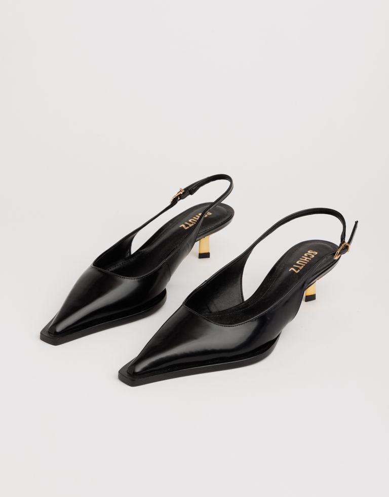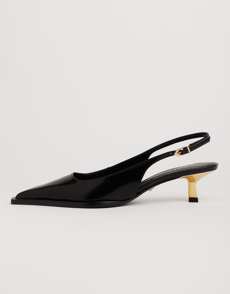 נעלי עקב קלאסיות עם חרטום שפיץ, עקב קיטן (Kitten) ואבזם – מוזהבים. נעליים שהן תמצית האלגנטיות.