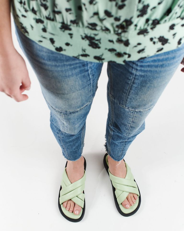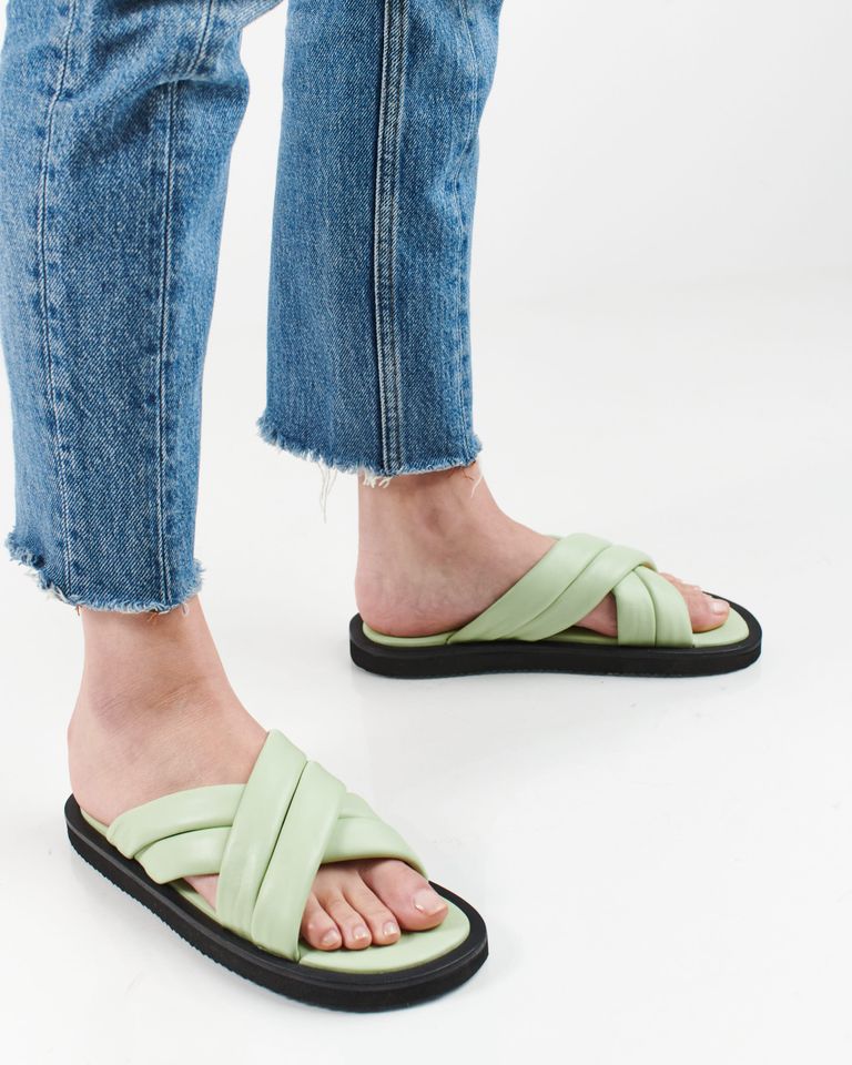 כפכפים שטוחים וקלילים (מפתיע, נכון?), עם רצועות עור תפוחות בצורת איקס וחרטום מרובע.