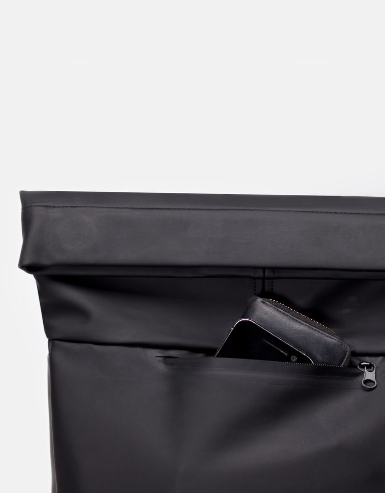 תיק גב מינימליסטי עם סגירה מגנטית, עשוי מחומר עמיד למים במראה קשיח ומבריק. לתיק תא מרכזי ובנוסף – כיס קדמי מוסתר וכיס אחורי בסגירת רוכסן (מתאים ללטפופים בגודל של עד 15.4 אינץ').