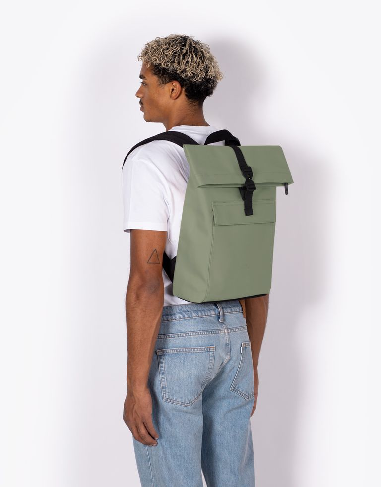 תיק גב JASPER LOTUS בגרסת המיני, תיק יוניסקס בעיצוב מינימליסטי עם סגירה באמצעות קיפול ואבזם. התיק טבעוני, עשוי מחומר דמוי עור ועמיד למים, הוא מתאים למחשב נייד עד 14 אינץ' ויש לו כיסים חיצוניים ופנימיים לנוחות מקסימלית.