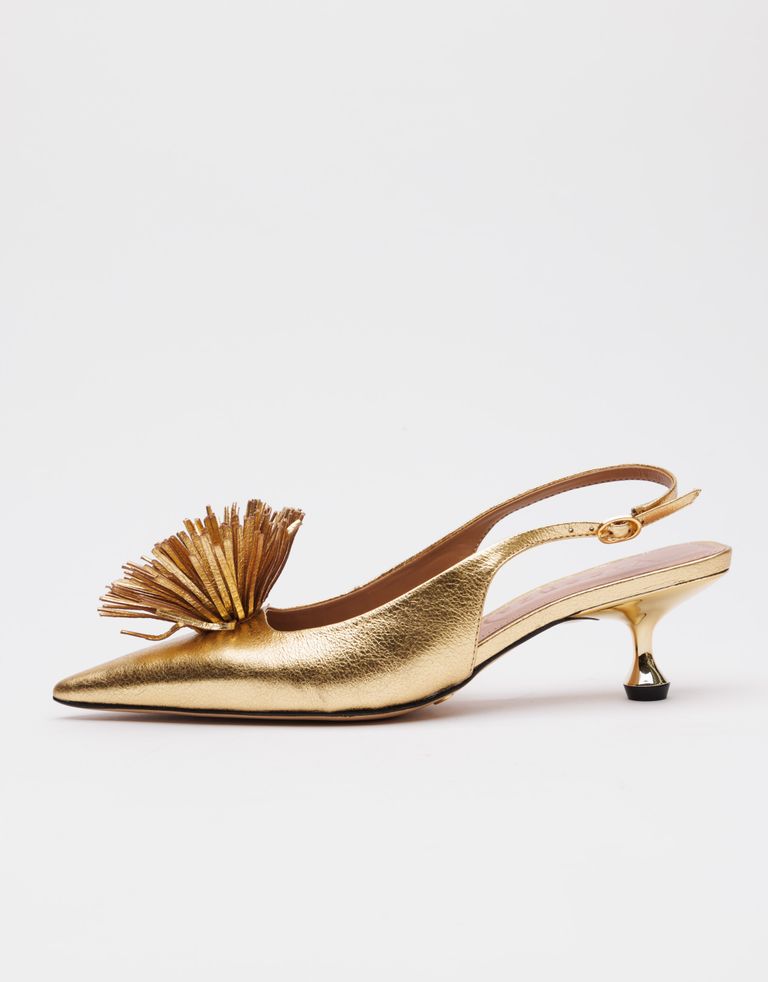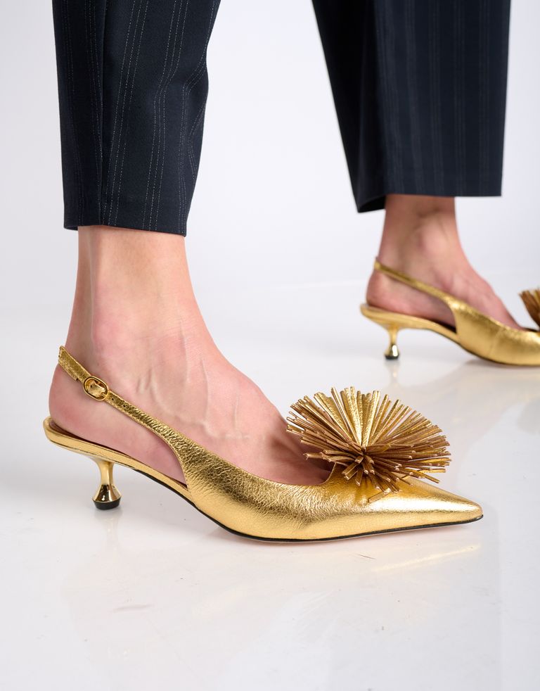 נעליים מעור עם עקב קיטן (kitten heel) מעודנים ועיטור פונפון בגוונים מטאליים.