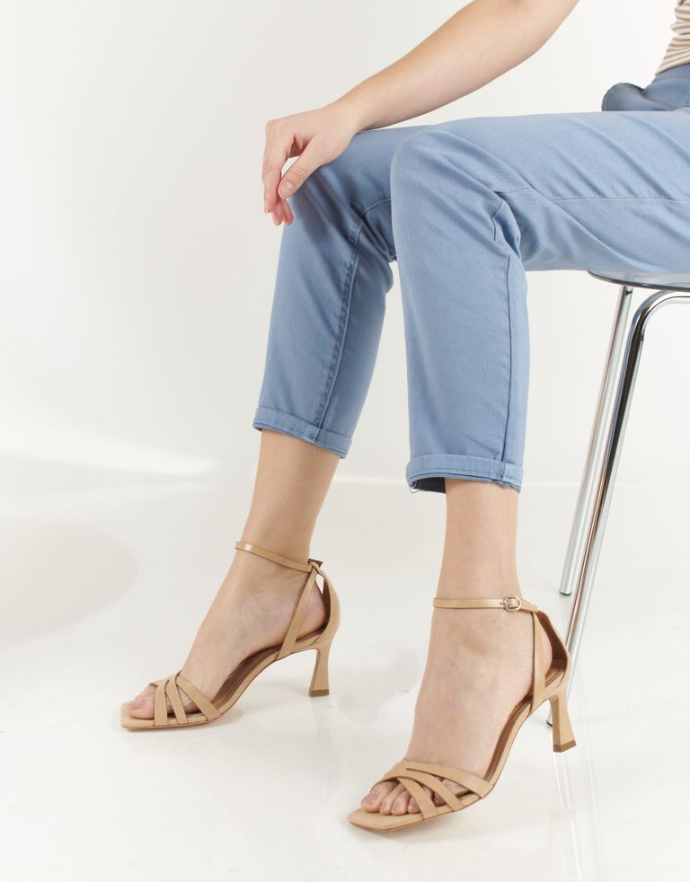 סנדלי רצועות עם עקב סטילטו בינוני עם טוויסט וסוליית עור איכותית. סנדלי נשים עדינים ומחמיאים אך עדיין תופסים כל מבט.