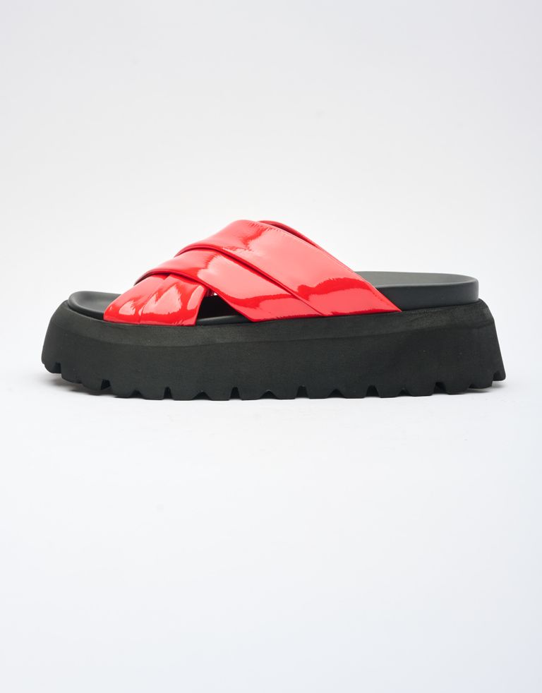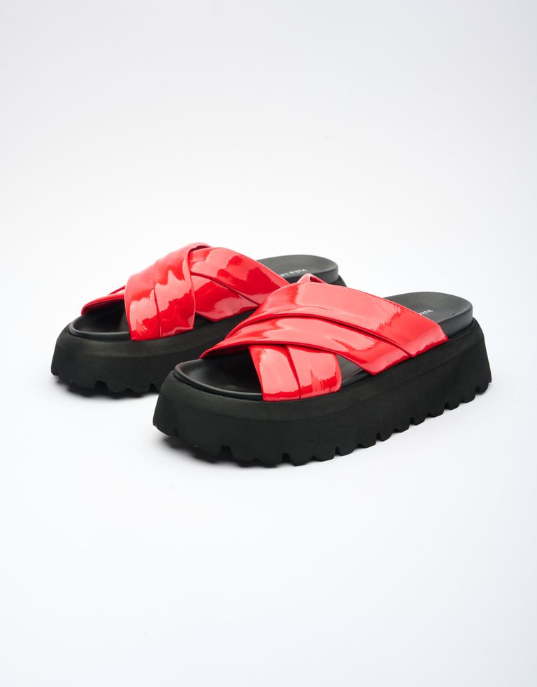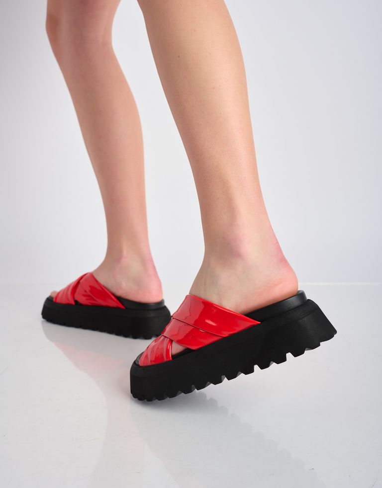 כפכפים עם רצועות עור מוצלבות במראה מבריק וסוליית פלטפורמה גבוהה במיוחד.